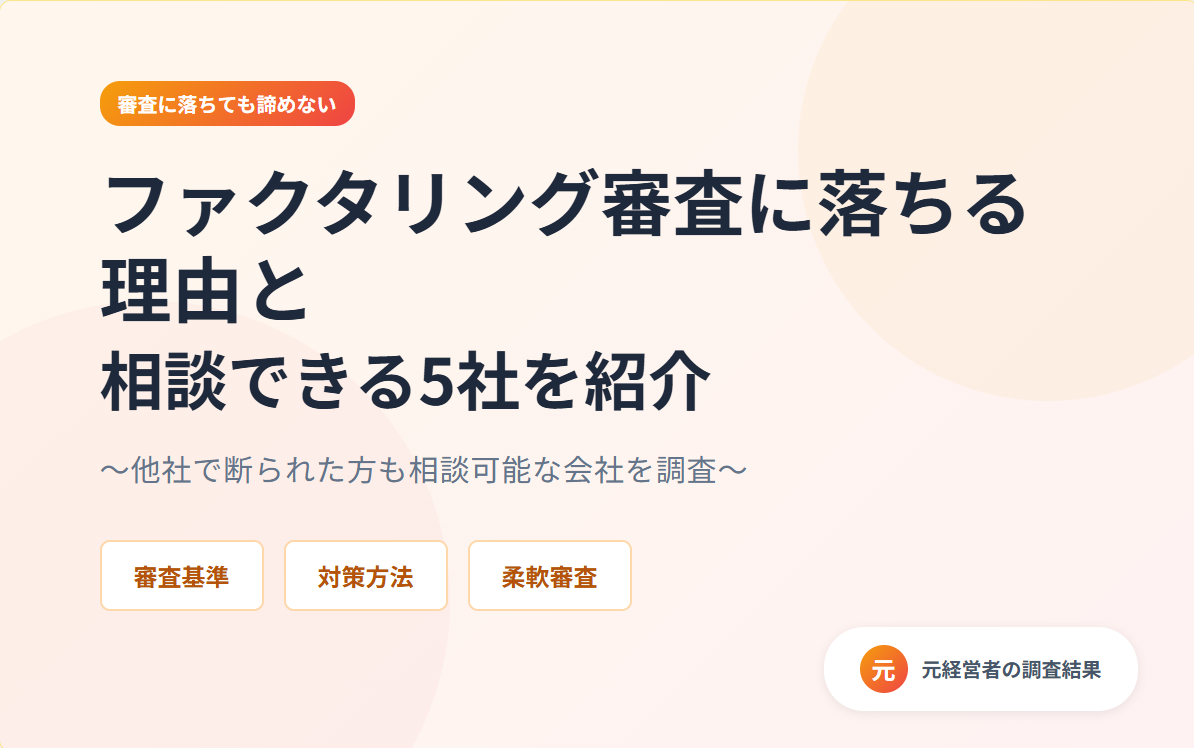 この記事では、 ・審査に落ちる主な原因 ・その具体的な対策 ・「他社で断られた方も相談可能」と明記しているファクタリング会社5社 をまとめてご紹介します。
