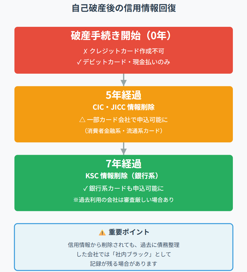 弁護士さんに聞くと、自己破産すると信用情報に記録が残り、だいたい5〜7年くらいは新しいクレジットカードを作るのは難しいという目安を教えてくれました。特に銀行系のカードは、信用情報機関によっては7年間記録が残る可能性があるそうです。