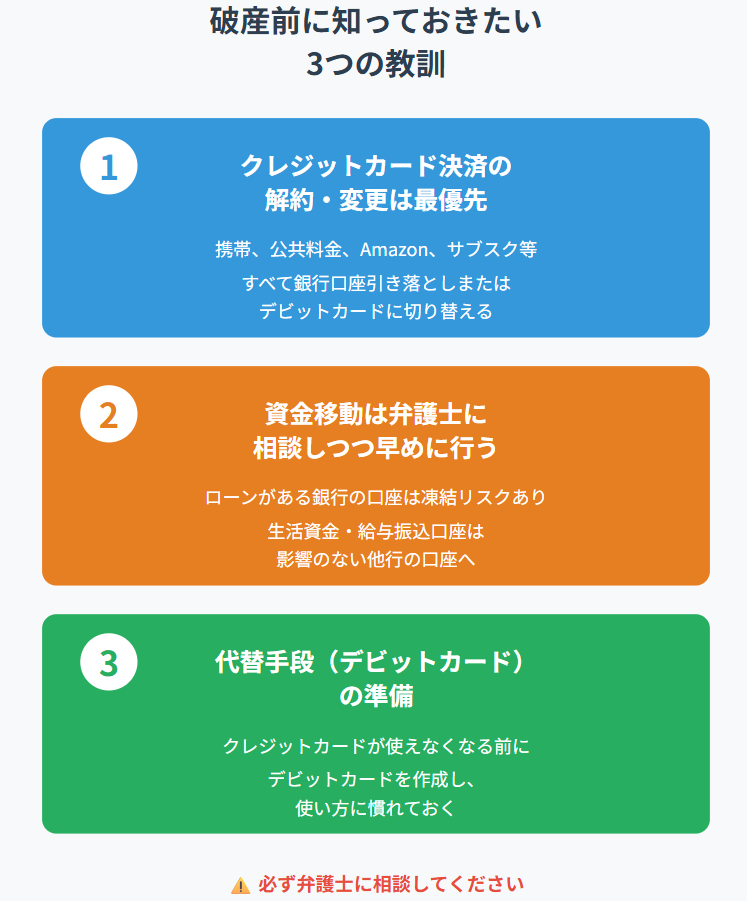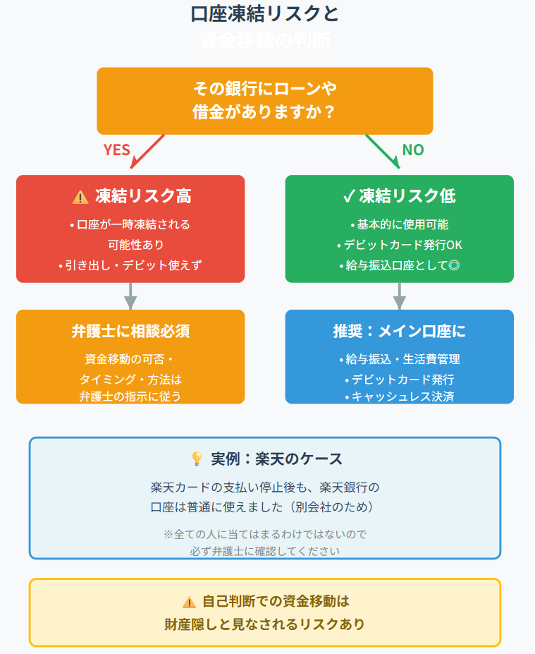 デビットカードは作れても、引き落としに使う口座自体が凍結されるリスクがあるため、事前に弁護士さんに確認し、資金の逃し場所を確保しておくことが重要です。
