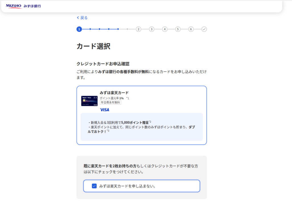 キャッシュカードにクレジットカードを付けるかどうかを選ぶ画面です。ご丁寧に「みずほ楽天カード」まで勧めてきます。