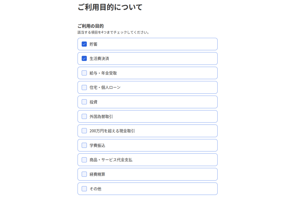 でも「ポイ活」という選択肢はありません。正直、ここは少し迷いました。変な選択をすると審査に落ちるんじゃないか、という不安もありました。「その他」にすればよかったのかもしれませんが、なんとなく「貯蓄」と「生活費決済」にチェックしました。