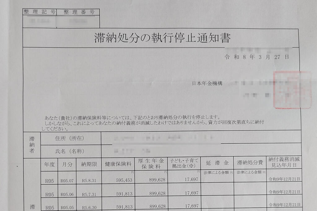 記載されていた金額は、健康保険料・厚生年金保険料・子ども子育て拠出金・延滞金を合わせて、合計約3,975万円でした。